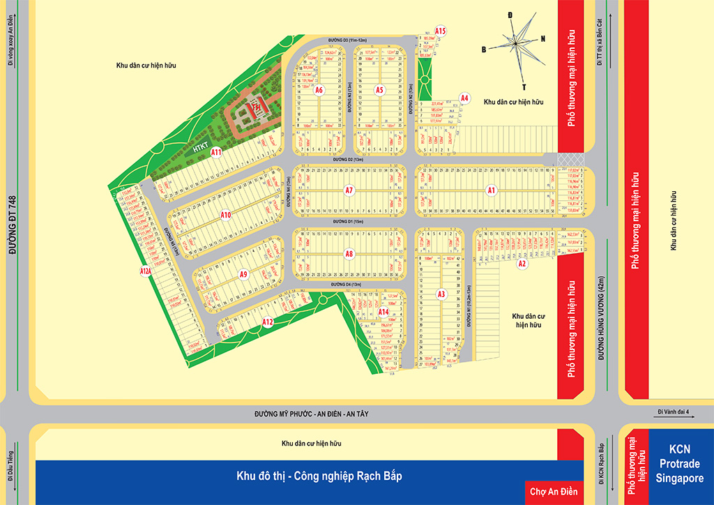 Hệ thống tiện ích: Phố thương mại, công viên, trường mầm non, trường Tiểu học An Điền, trường Tiểu học Trần Quốc Tuấn, trường quốc tế Phù Đổng, trrường Đại học Quốc tế Việt Đức, chợ An Điền, chợ Bến Cát, TTHC thị xã Bến Cát, trung tâm điện máy Thiên Hòa, trung tâm triển lãm Bến Cát, bệnh viện đa khoa Mỹ Phước, khu đô thị – công nghiệp Mỹ Phước, KCN Rạch Bắp, KCN Protrade Singapore…