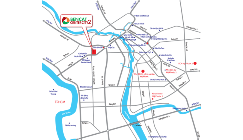 Khu đô thị Ben Cat Center City 2 tọa lạc mặt tiền Hùng Vương và Mỹ Phước - An Điền - An Tây, An Điền, thị xã Bến Cát, một trong những khu vực phát triển năng động bậc nhất tỉnh Bình Dương. Ben Cat Center City 2 được hứa hẹn sẽ là cơ hội đầu tư kinh doanh hấp dẫn, đồng thời có giá trị không ngừng gia tăng theo thời gian.