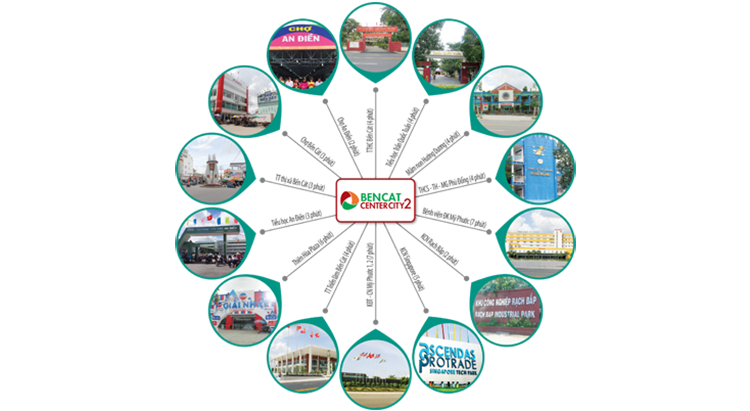 Thị xã Bến Cát đang được đầu tư mạnh mẽ để trở thành đô thị loại 2 trước năm 2020. Chính vì vậy, lĩnh vực thương mại – dịch vụ tại đây cũng đang bùng nổ nhằm đáp ứng nhu cầu của người dân. Chỉ mất từ 2-7 phút, mọi nhu cầu của cư dân của Bến Cát Center City 2 sẽ được đáp ứng ngay với phố thương mại, công viên, trường mầm non, trường Tiểu học An Điền, trường Tiểu học Trần Quốc Tuấn, trường THCS – Mẫu giáo Phù Đổng, chợ An Điền, chợ Bến Cát, TTHC thị xã Bến Cát, trung tâm điện máy Thiên Hòa, trung tâm triển lãm Bến Cát, bệnh viện đa khoa Mỹ Phước…