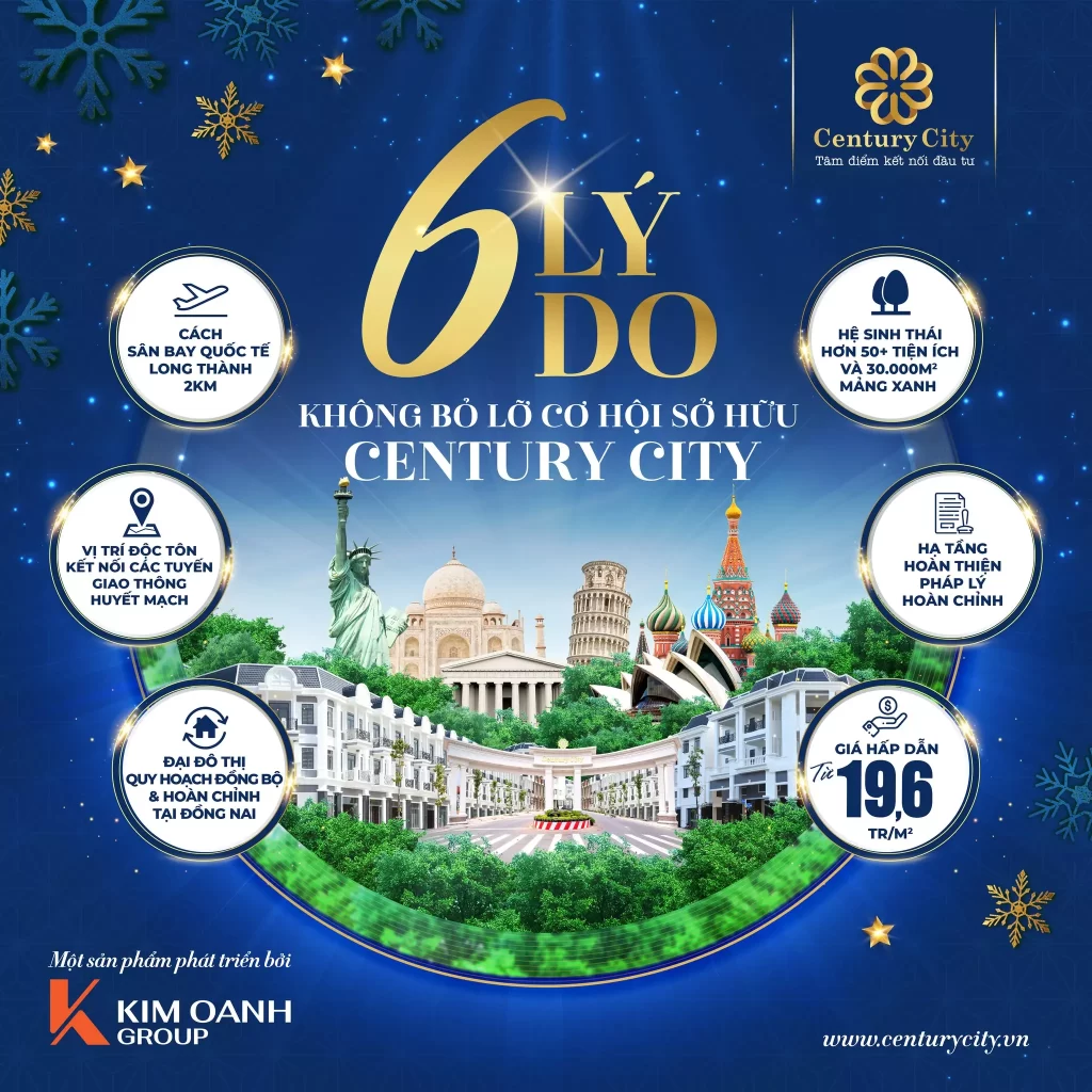 Khu đô thị Century City là dự án do phát triển bởi Kim Oanh Group, có quy mô 49,8 ha với 2.128 căn shophouse, nhà liên kế vườn, biệt thự và khu căn hộ cao tầng, tọa lạc ngay trung tâm đô thị Thành phố Sân bay Long Thành.
