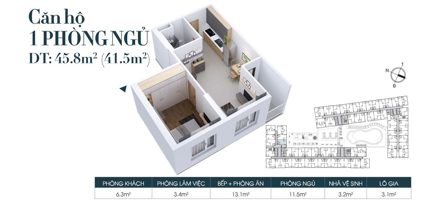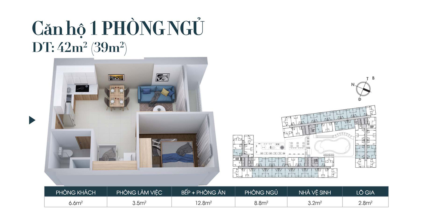 Căn hộ 1 phòng ngủ: 42 – 45.8m2