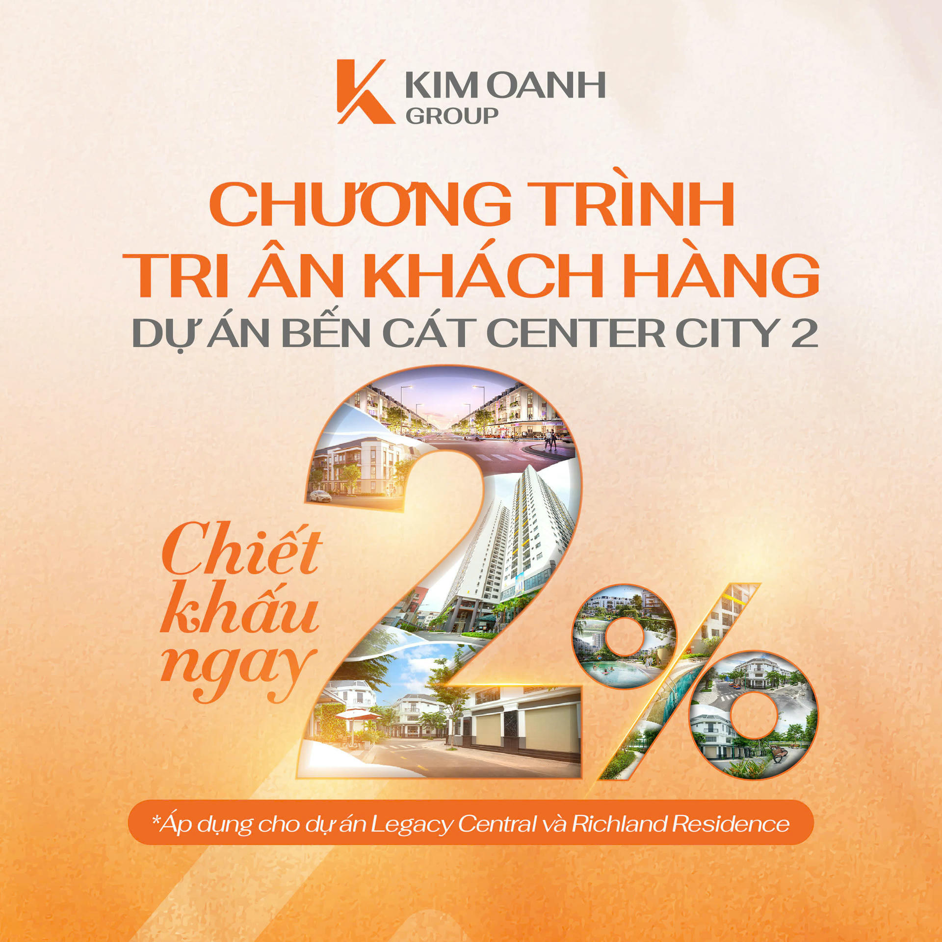 Để tri ân những khách hàng đã tin tưởng lựa chọn dự án Bến Cát Center City 2, Kim Oanh Group đã gửi tặng voucher chiết khấu 2% khi khách hàng tiếp tục đầu tư vào dự án khu đô thị Richland Residence hoặc khu căn hộ Legacy Central đang được Kim Oanh Group giới thiệu ra thị trường.