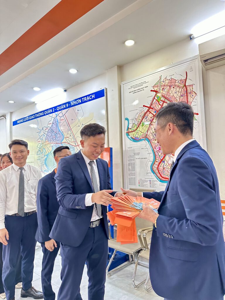 Ông Nguyễn Lương Thọ – Phó Tổng Giám đốc Vận hành và ông Tô Duy Chinh – Giám đốc Khối Kinh doanh tập đoàn chúc Tết và động viên tinh thần lãnh đạo, nhân viên chi nhánh Thành Phố Mới