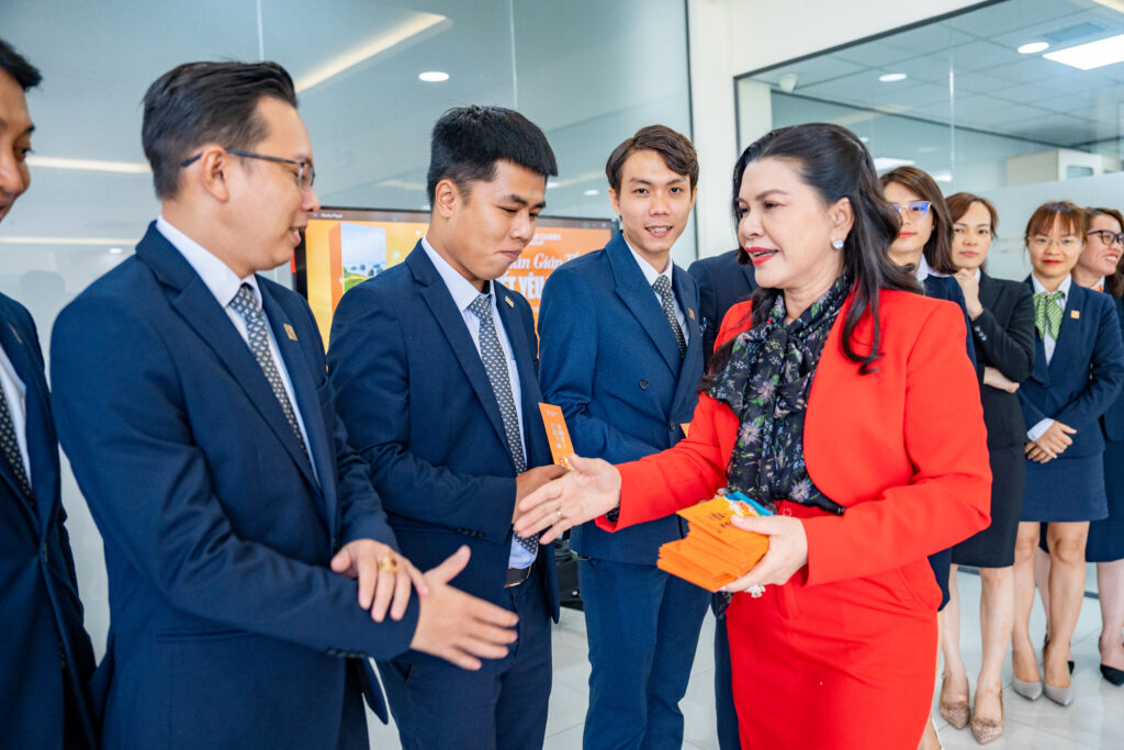Bà Nguyễn Ngọc Ánh – Phó Chủ tịch HĐQT Tập đoàn chúc Tết và lì xì năm mới cho CBNV chi nhánh Điện Biên Phủ