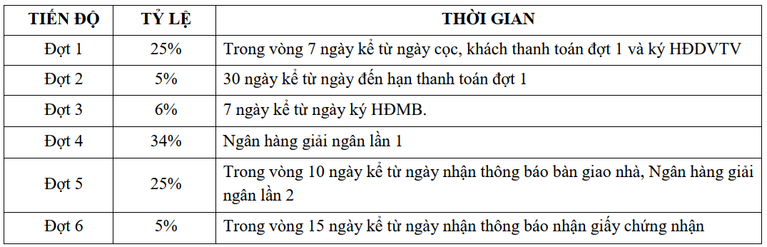 - Trong vòng 30 ngày kể từ ngày được thông báo ký HĐMB, khách hàng phải hoàn tất ký HĐMB và thủ tục vay ngân hàng (gồm giải ngân).