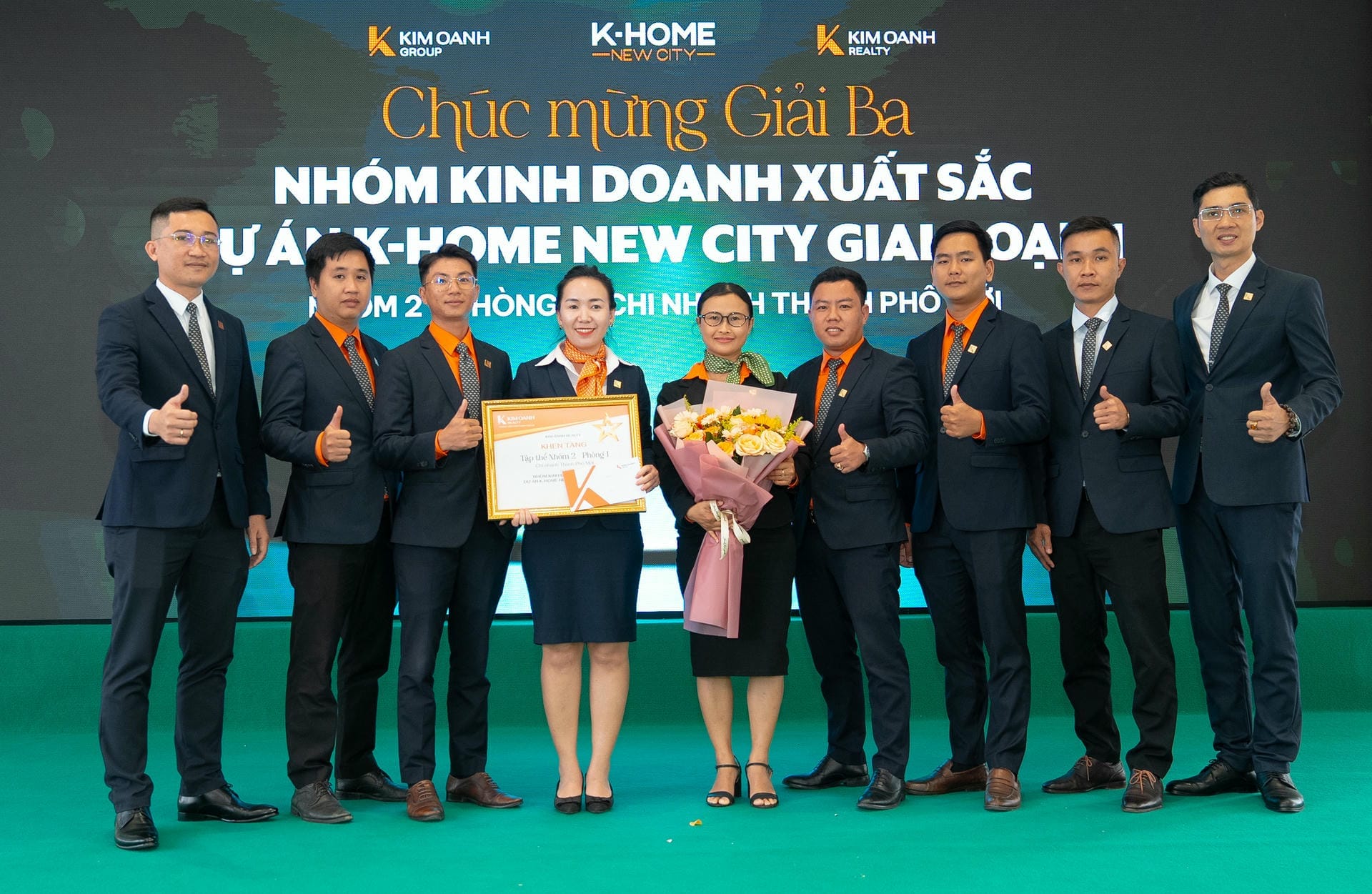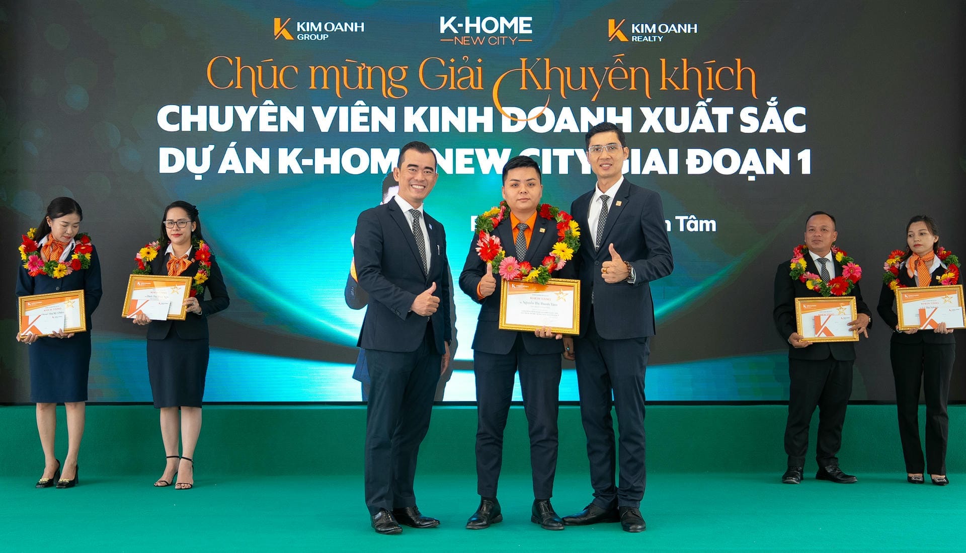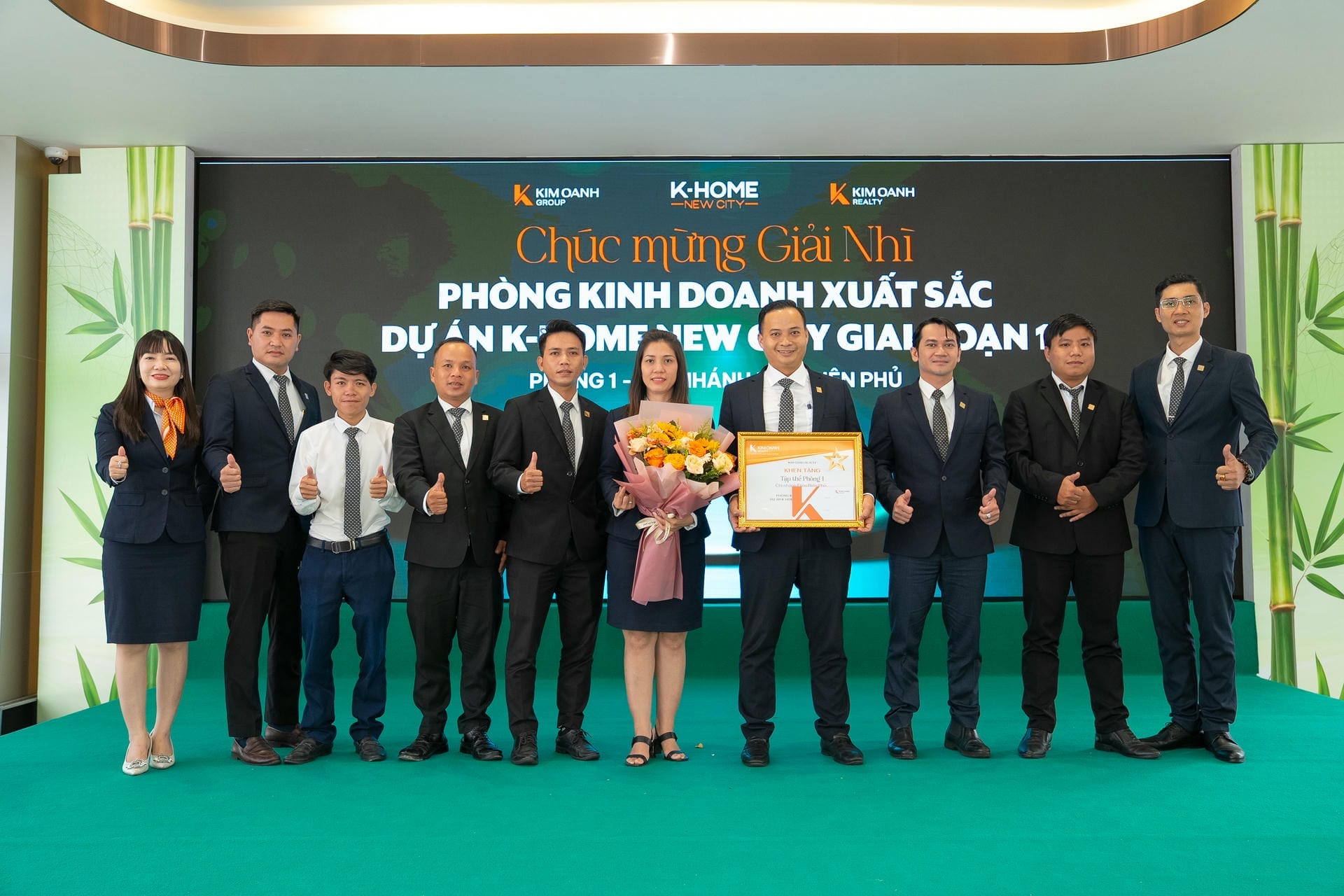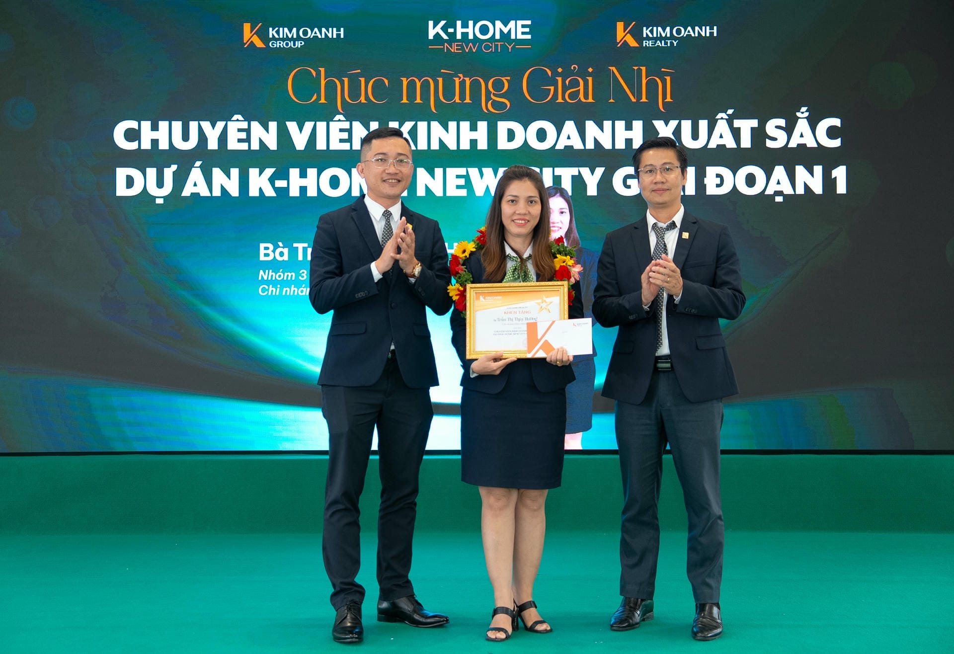 Nhóm 1 (phòng 1, chi nhánh Thành Phố Mới) được vinh danh giải Nhất hạng mục Nhóm kinh doanh xuất sắc dự án K-Home New City giai đoạn 1, giải thưởng được trao bởiông Nguyễn Lương Thọ và ông Trịnh Thanh Tuấn.