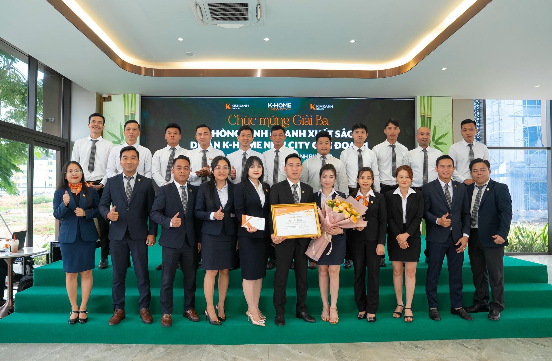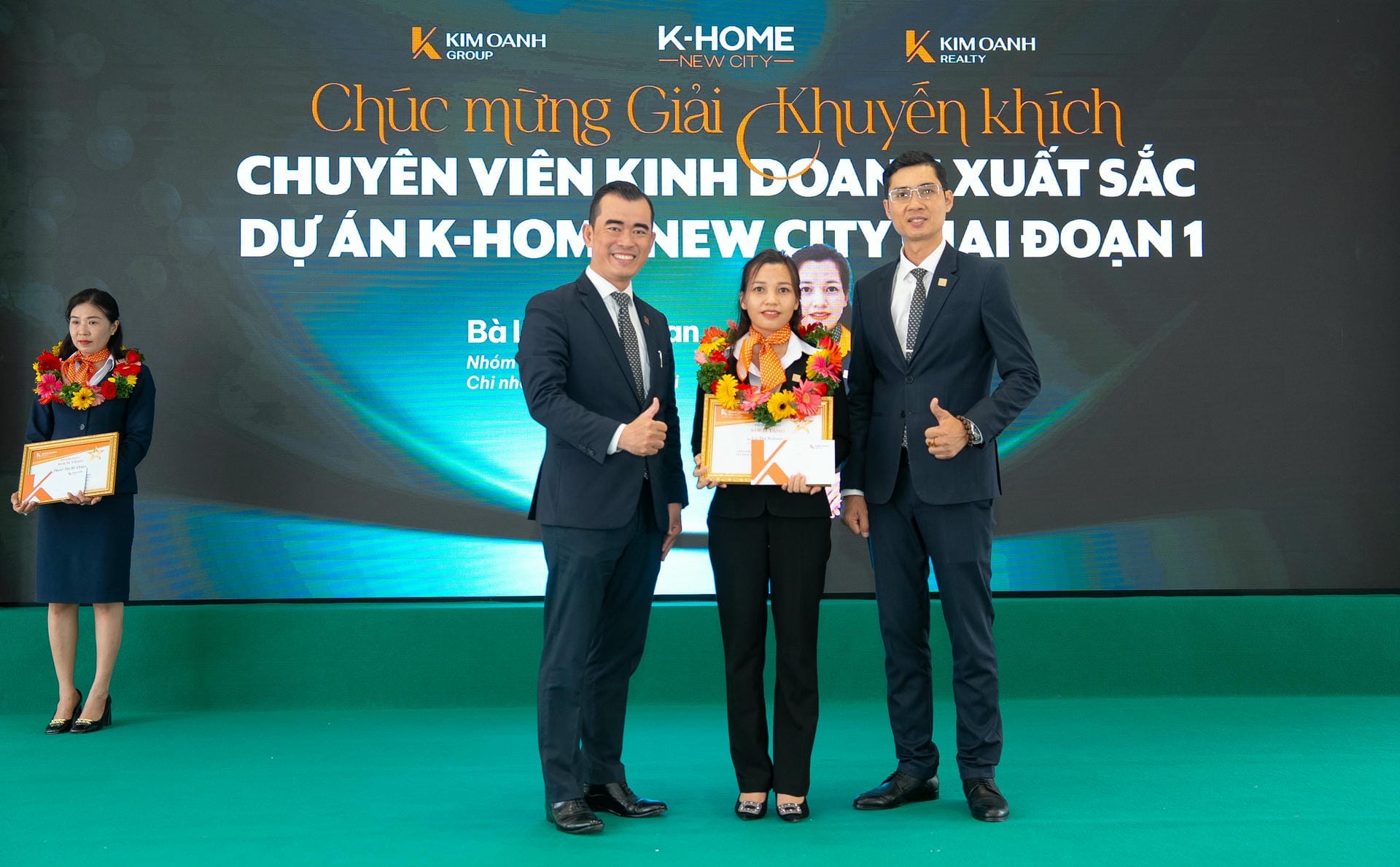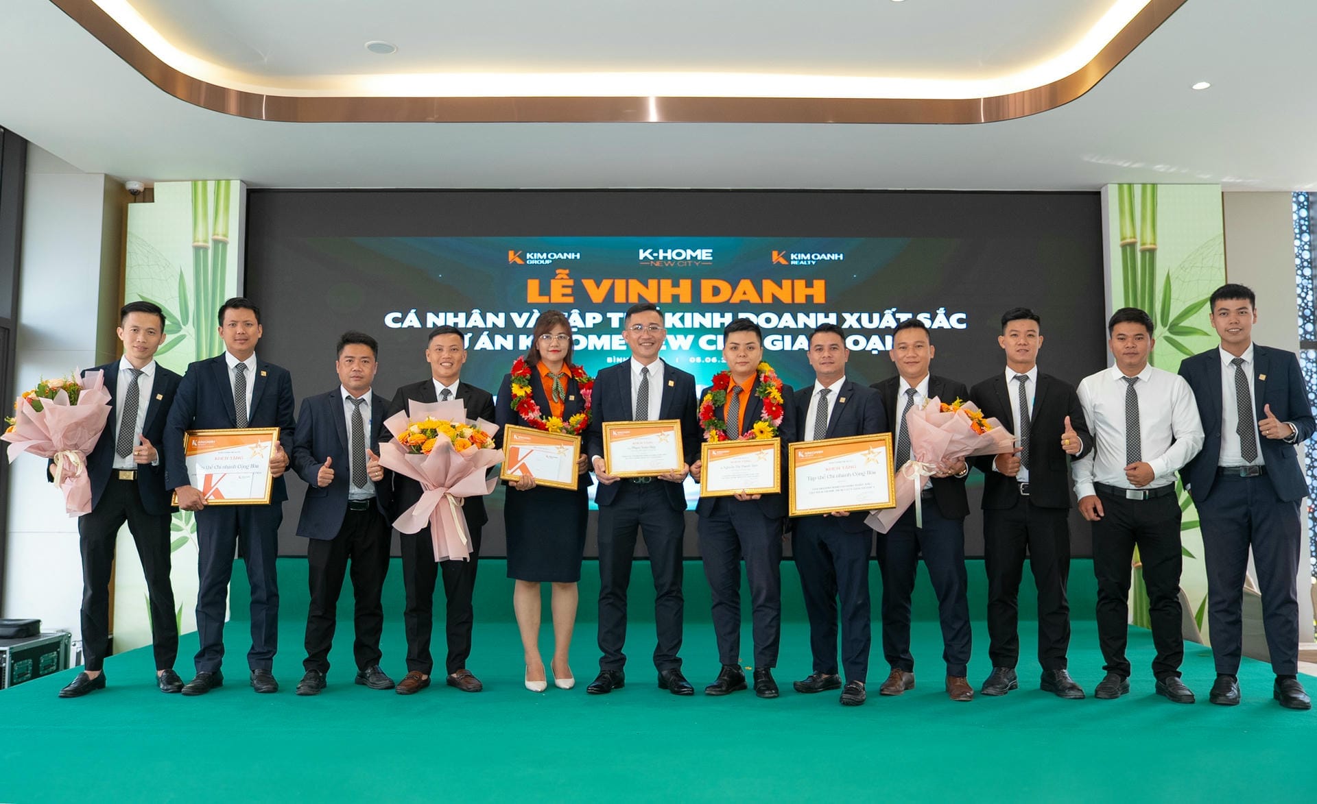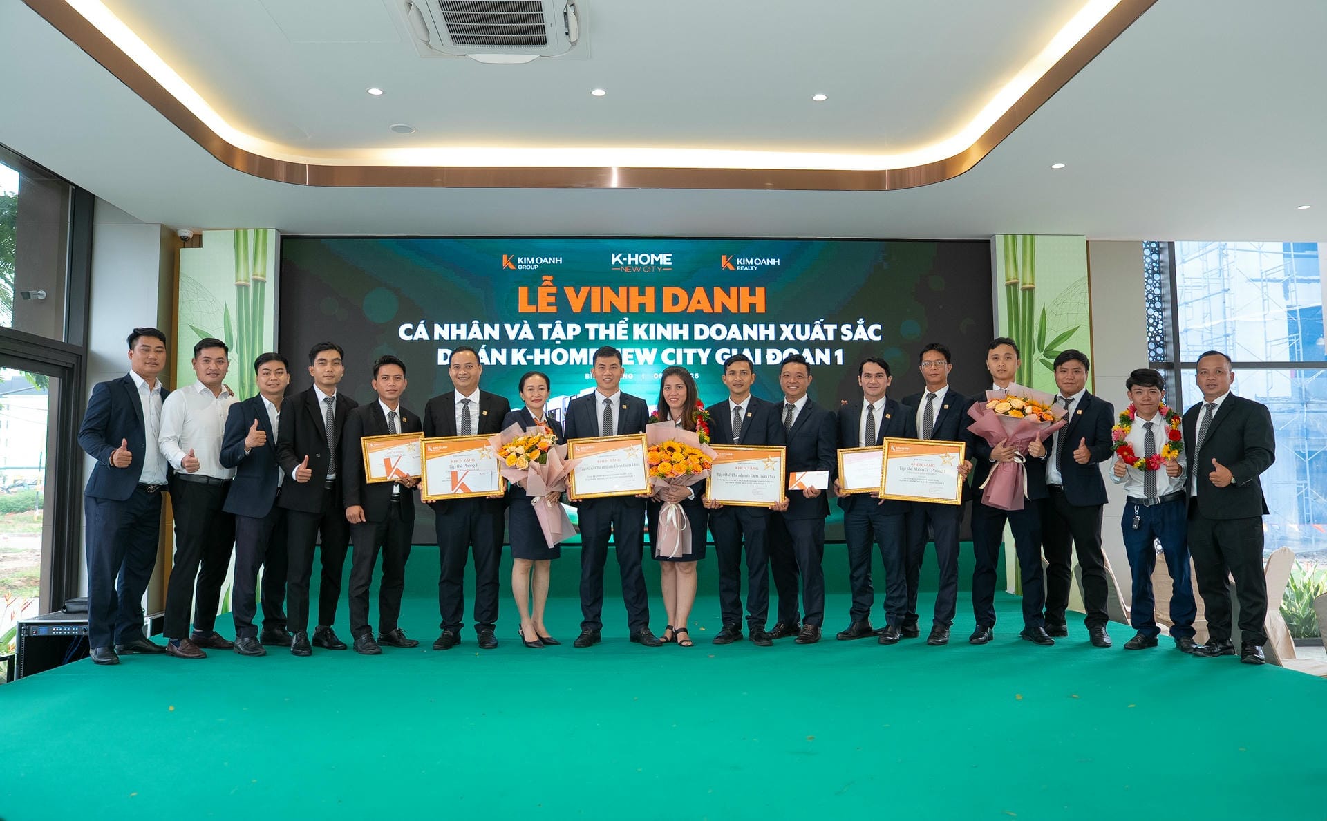 Nhóm 1 (phòng 1, chi nhánh Thành Phố Mới) được vinh danh giải Nhất hạng mục Nhóm kinh doanh xuất sắc dự án K-Home New City giai đoạn 1, giải thưởng được trao bởiông Nguyễn Lương Thọ và ông Trịnh Thanh Tuấn.