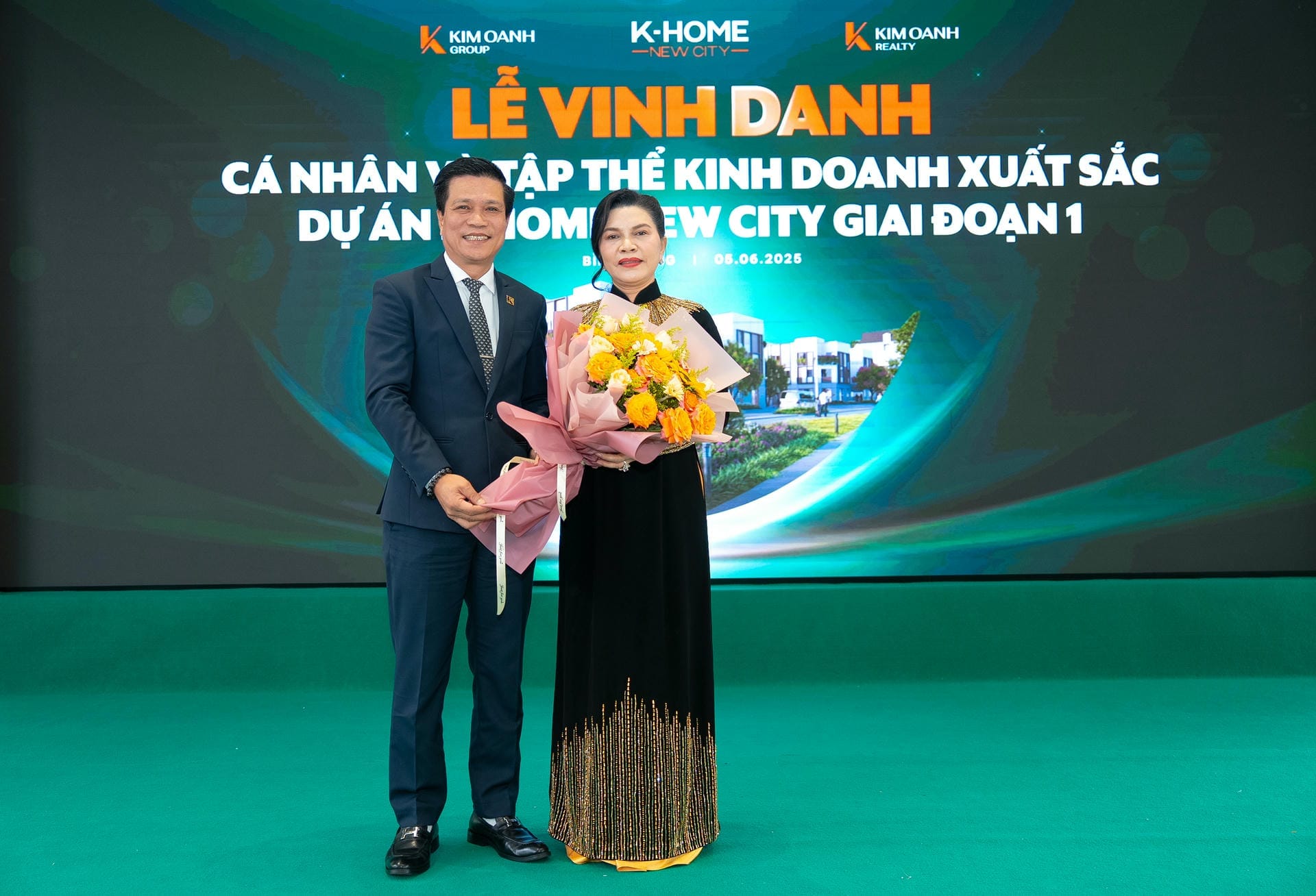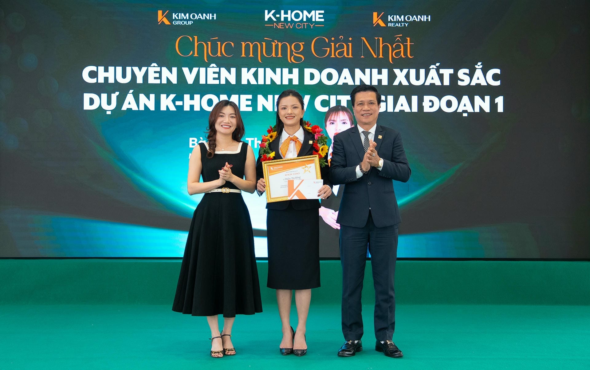Chị Thiều Thị Hồng (chi nhánh Thành Phố Mới) xuất sắc giành giải Nhất hạng mục Chuyên viên kinh doanh xuất sắc dự án K-Home New City giai đoạn 1, được trao tặng bởi bà Nguyễn Ngọc Ánh và ông Tô Duy Chinh.