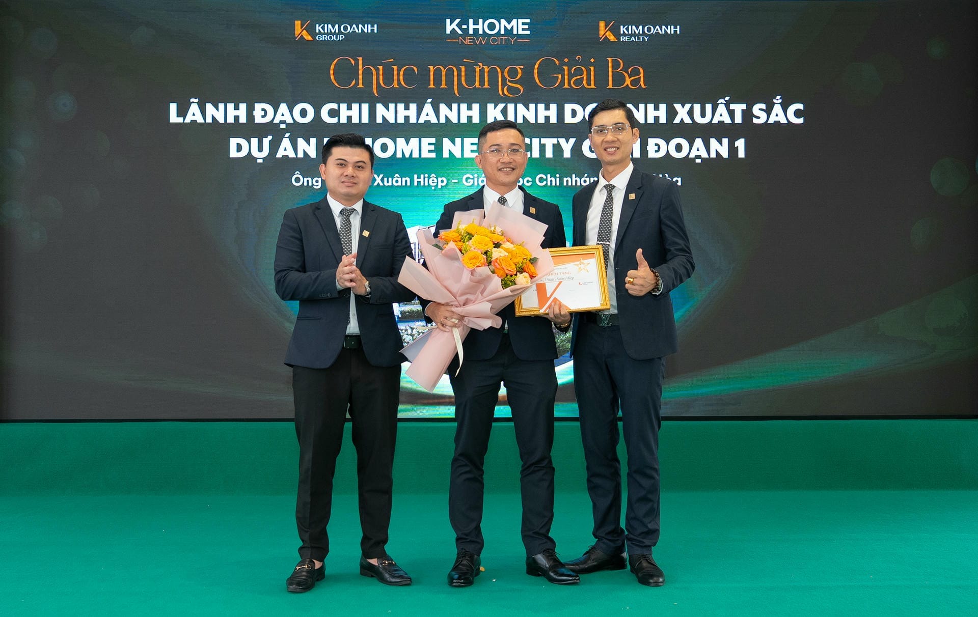 Ông Phạm Xuân Hiệp – Giám đốc Chi nhánh Cộng Hòa được vinh danh giải Ba hạng mục Lãnh đạo chi nhánh xuất sắc nhất, giải thưởng được trao bởi Ông Bùi Anh Đức và ông Tôn Thất Phúc – Phó giám đốc Chiến lược & Quản lý sản phẩm Kim Oanh Land.