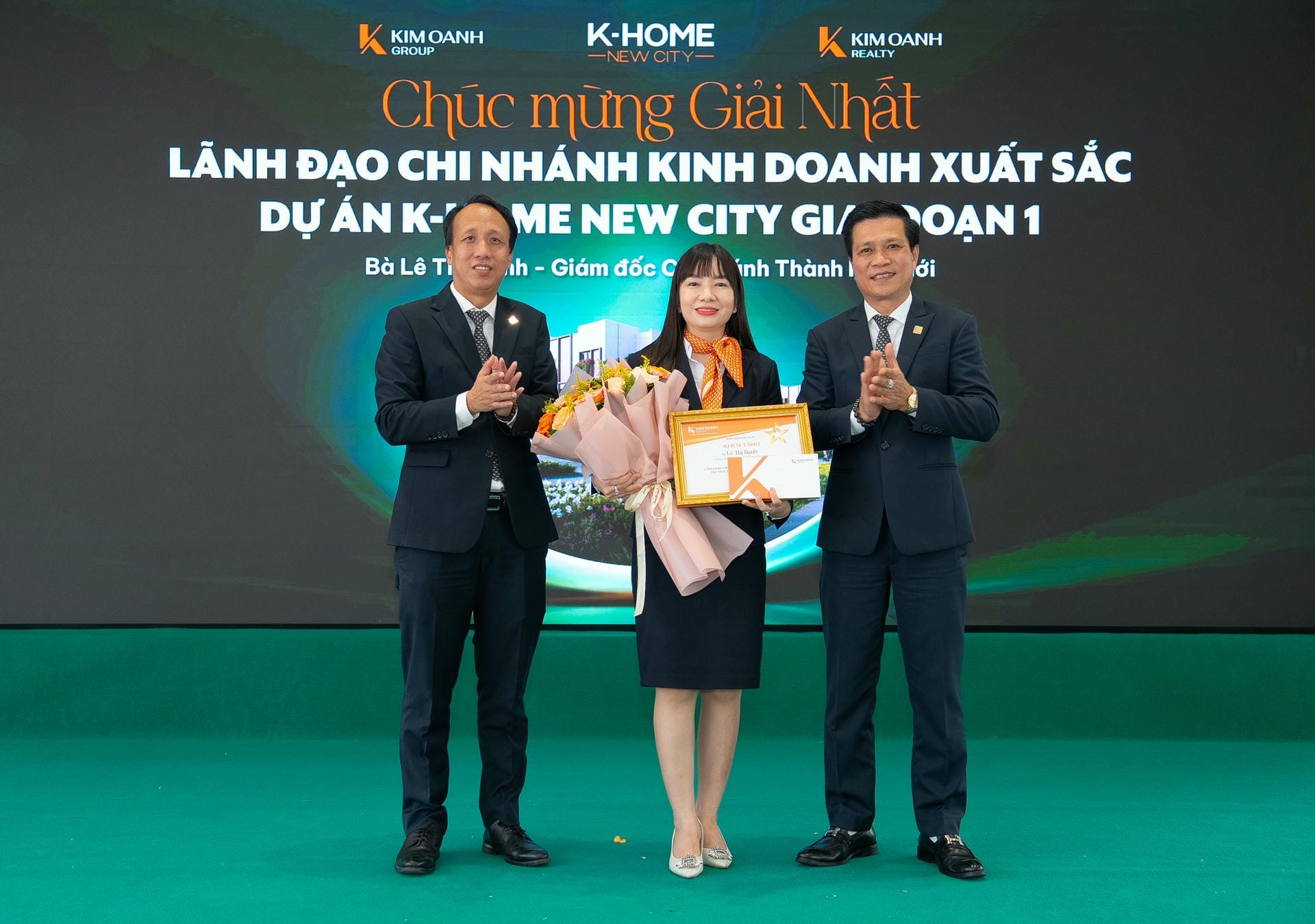 Bà Lê Thị Hạnh – Giám đốc Chi nhánh Thành Phố Mới được vinh danh giải Nhất hạng mục Lãnh đạo chi nhánh xuất sắc nhất dự án K-Home New City giai đoạn 1, được trao bởi ông Nguyễn Lương Thọ – Phó Tổng giám đốc Vận hành Tập đoàn và ông Tô Duy Chinh.